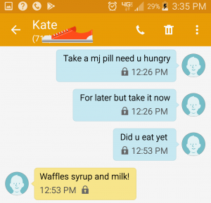 A little while later I sent her a message to take her Marinol pills, so that she would be less nauseous and hopefully have an appetite. (we called them mj pills to be funny, but they are just synthetic THC) I was going to surprise her with some crab cakes later if she was in the mood.