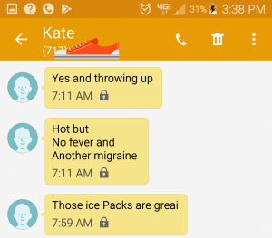 This day from a year ago started off a little rough. We spoke in the morning after she sent me a text describing how she was feeling. On the call she was complaining of a terrible migraine, being super hot, and throwing up. She was borderline crying and clearly upset a little. I told her to try one of the new ice packs that we had and to try some slow breathing through her nose.